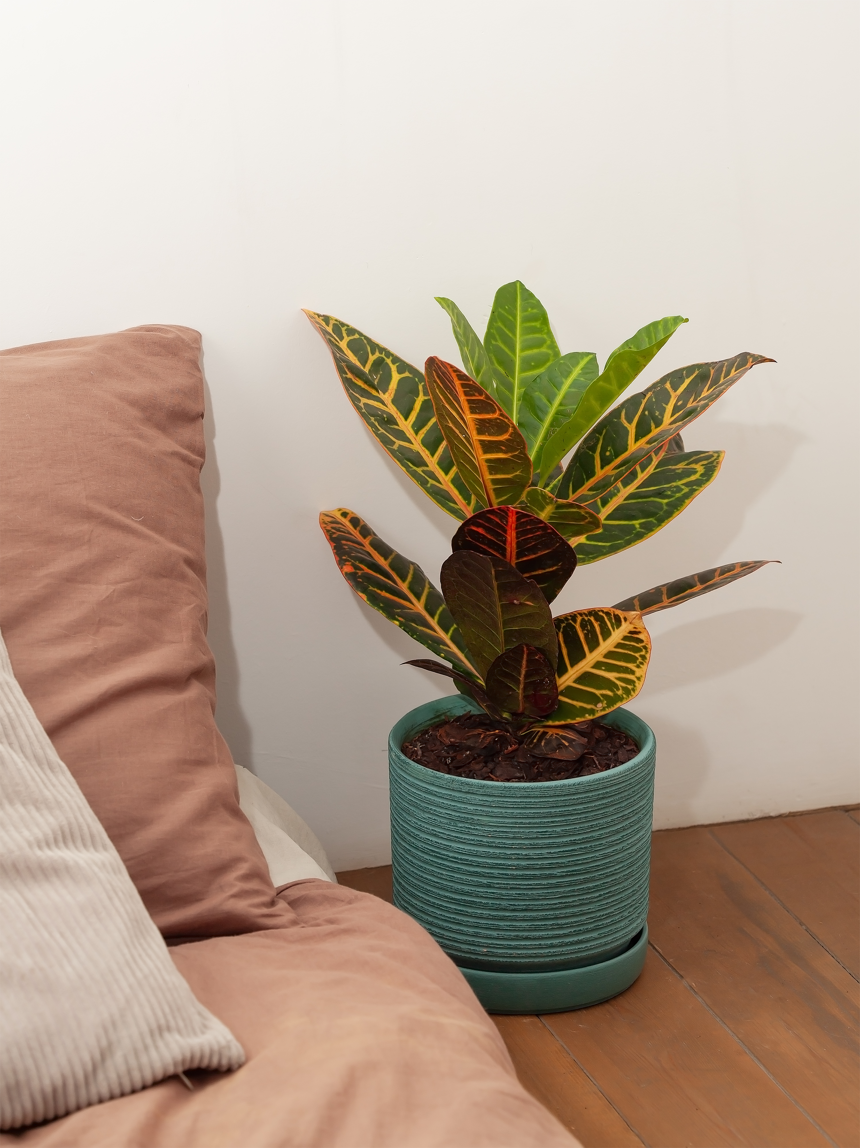 Кодиеум «Петра» достаточно быстро растет и охотно ветвится, что позволяет ему даже в солидном возрасте выглядеть пышно и интересно.